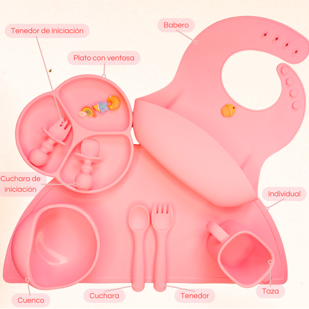 Nuestro set, es además ideal para la hora de salir a comer con familiares y amigos. Incluye nuestros favoritos de silicona de grado alimenticio para ayudar a los bebés en su transición a los sólidos.